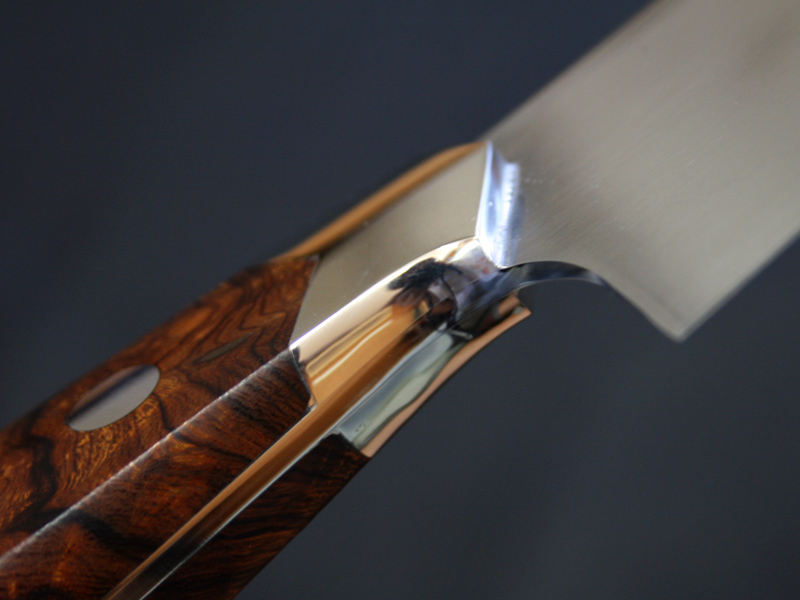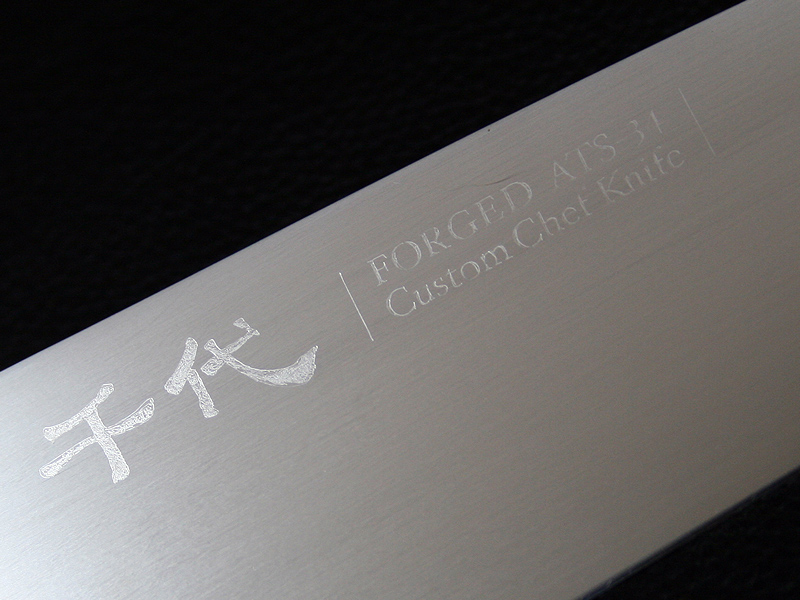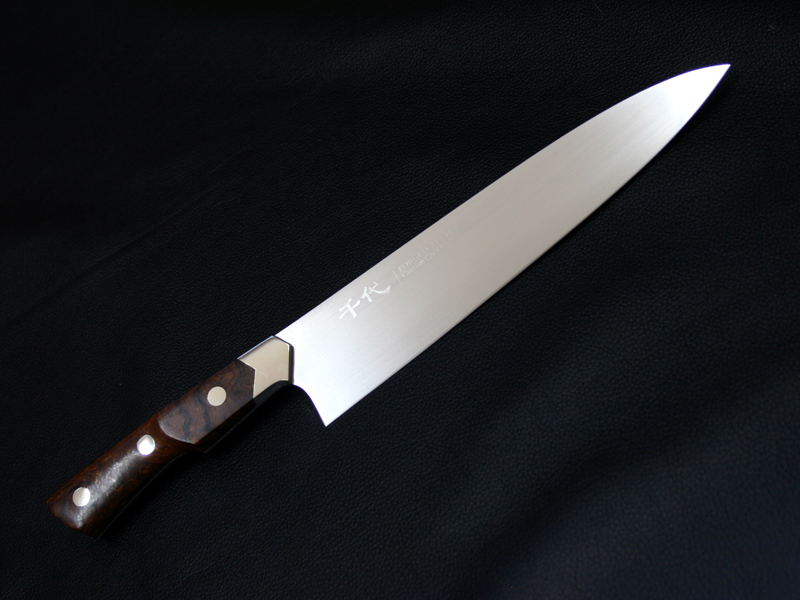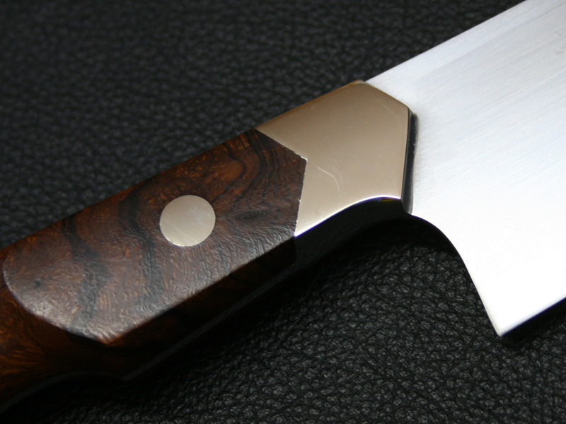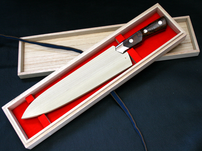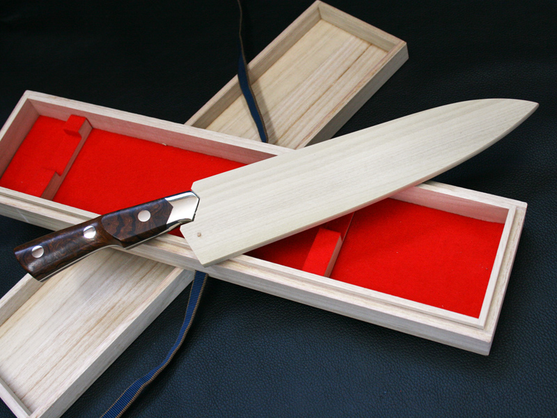 This custom chef / kitchen knife by Koji Hara features a forged ATS-34 Stainless steel knife. Forged ATS-34 stainless steel sharpness is outstanding and sharpness of a knife is different so far. The full tang blade is tapered to the end of handle for a perfect weight balance. Contoured desert ironwood handle fits firmly in hand and nickel silver bolster. The kitchen knife comes with a original paulownia box and sheath.