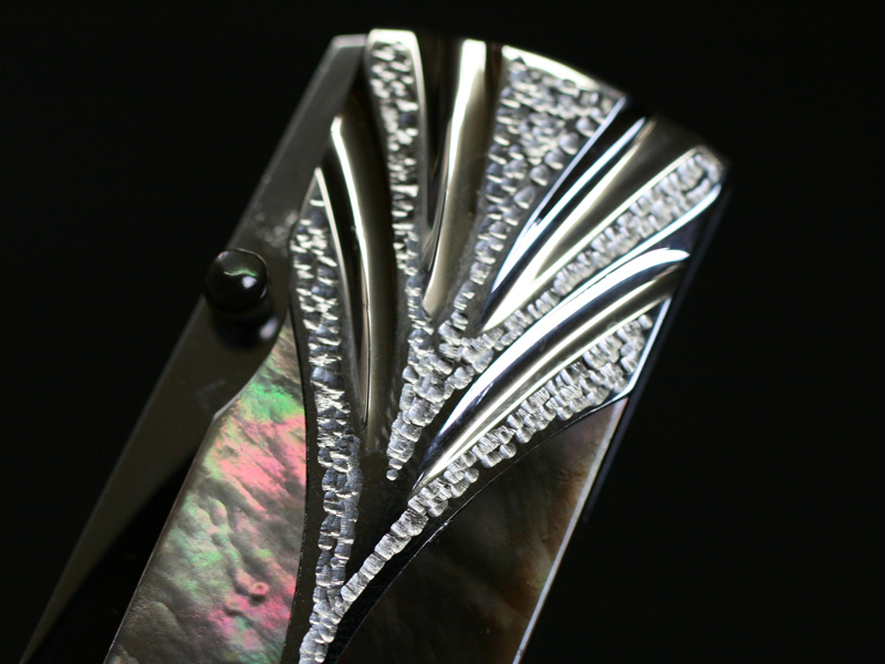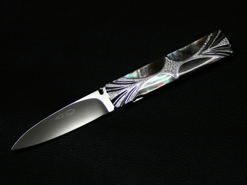 This liner-lock folder by Koji Hara features a High mirror polished Cowry-Y powdered steel blade and hammered finish and carved fluting stainless steel with Black Lip Mother of Pearl inlyaed. Black lip mother of pearl inlayed thumb stud. The knife comes with Japanese Kimono cloth pouch.