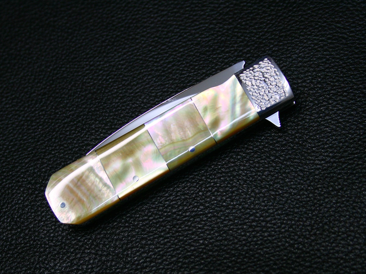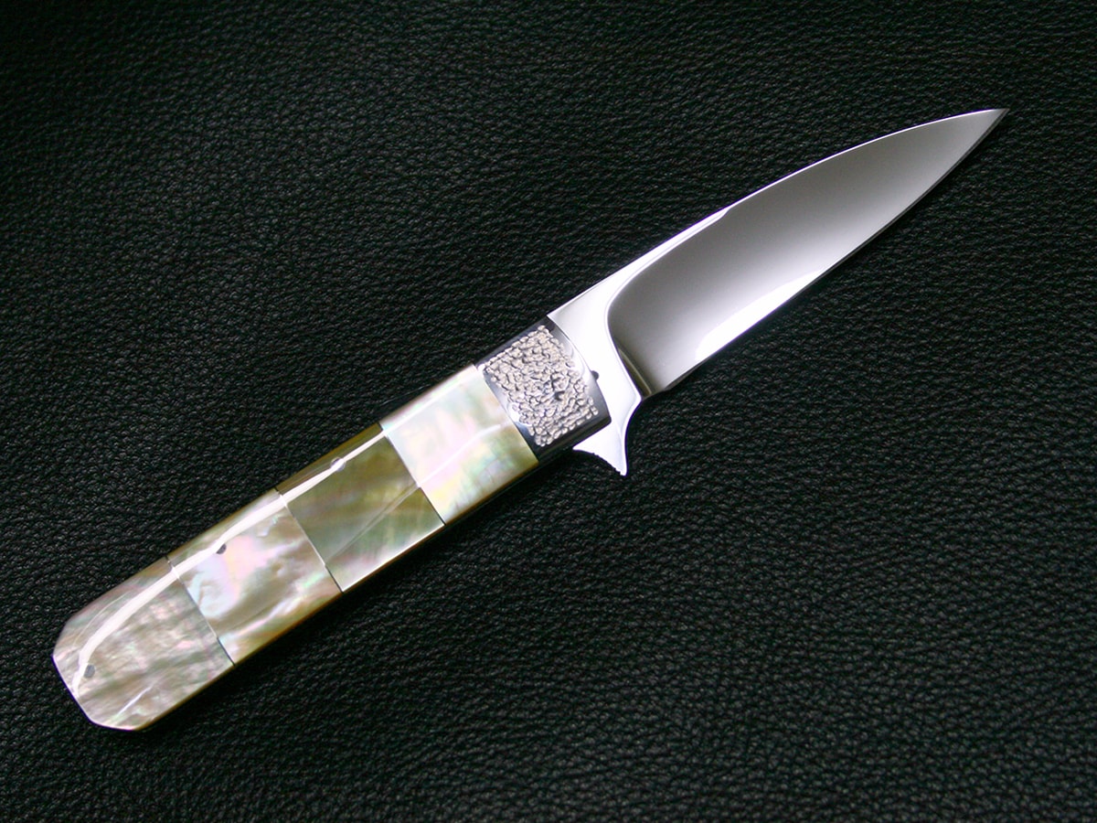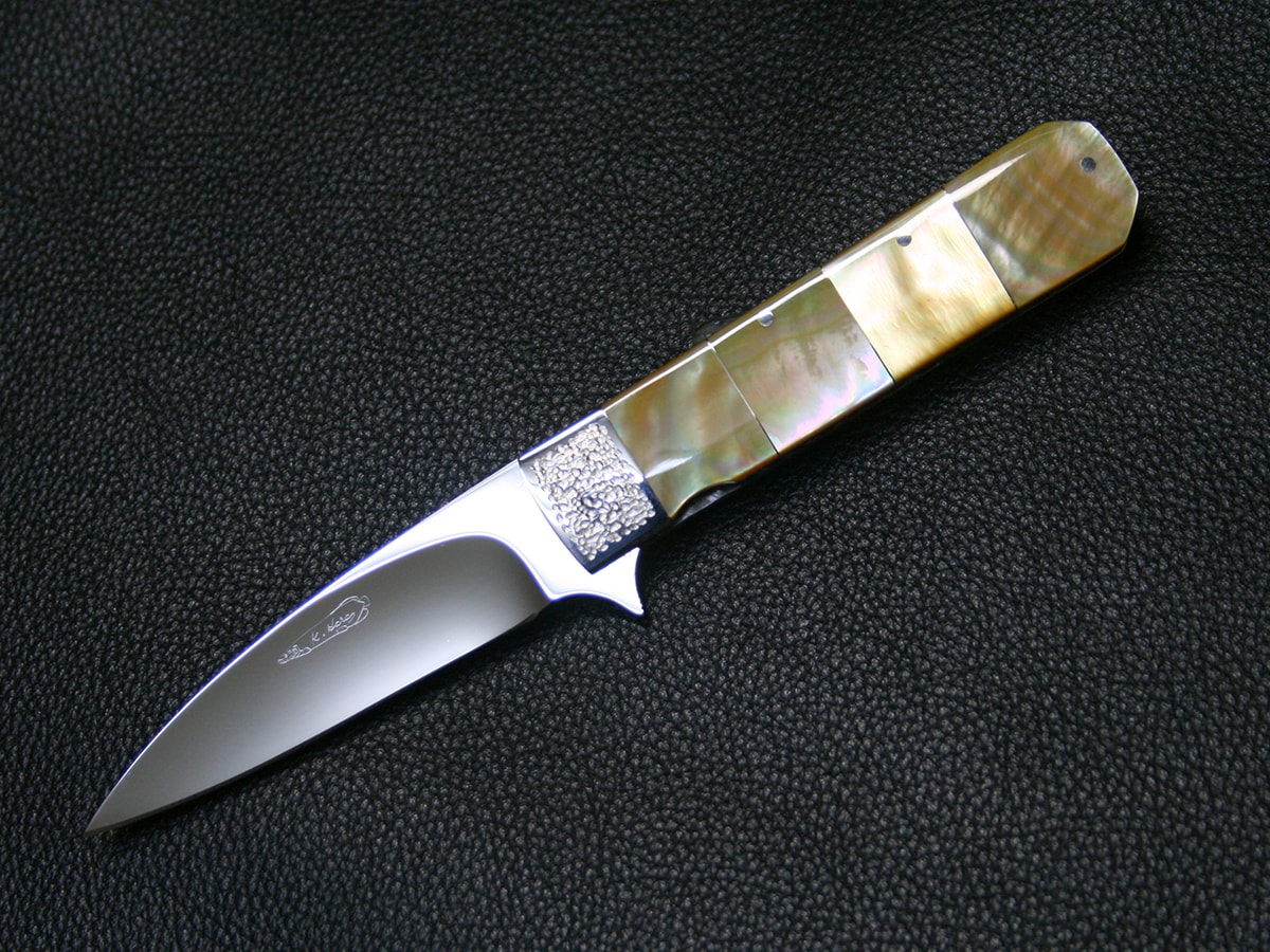 The flipper liner-lock folder by Koji Hara. It features a mirror polished Cowry-Y steel drop point style blade and hand-dimpled stainless steel bolster and perfectly shaped and polished gold lip pearl in the handle. Nickel silver spacer in each pearl. The spine of the handle spacer have gold lip pearl in it.