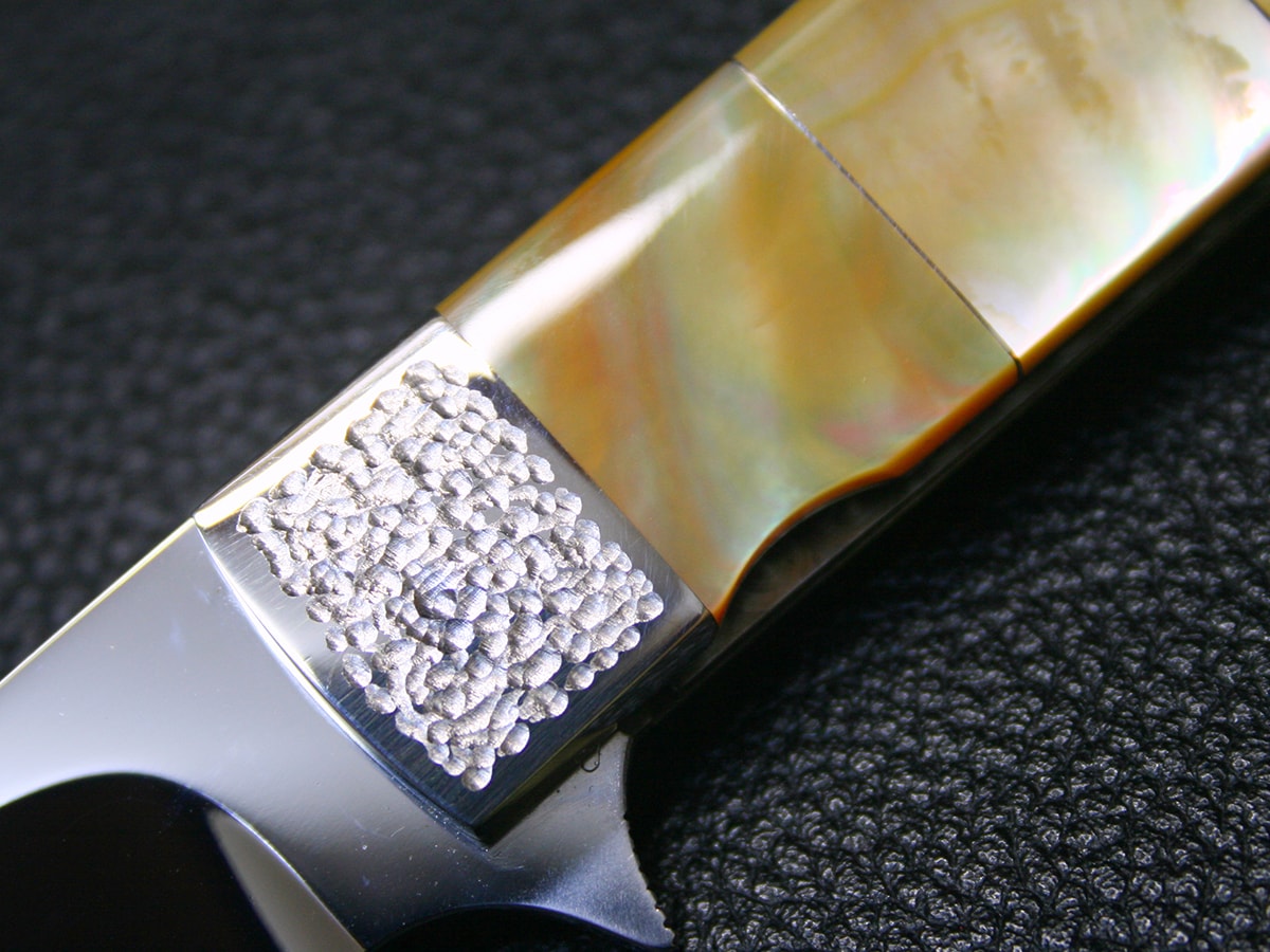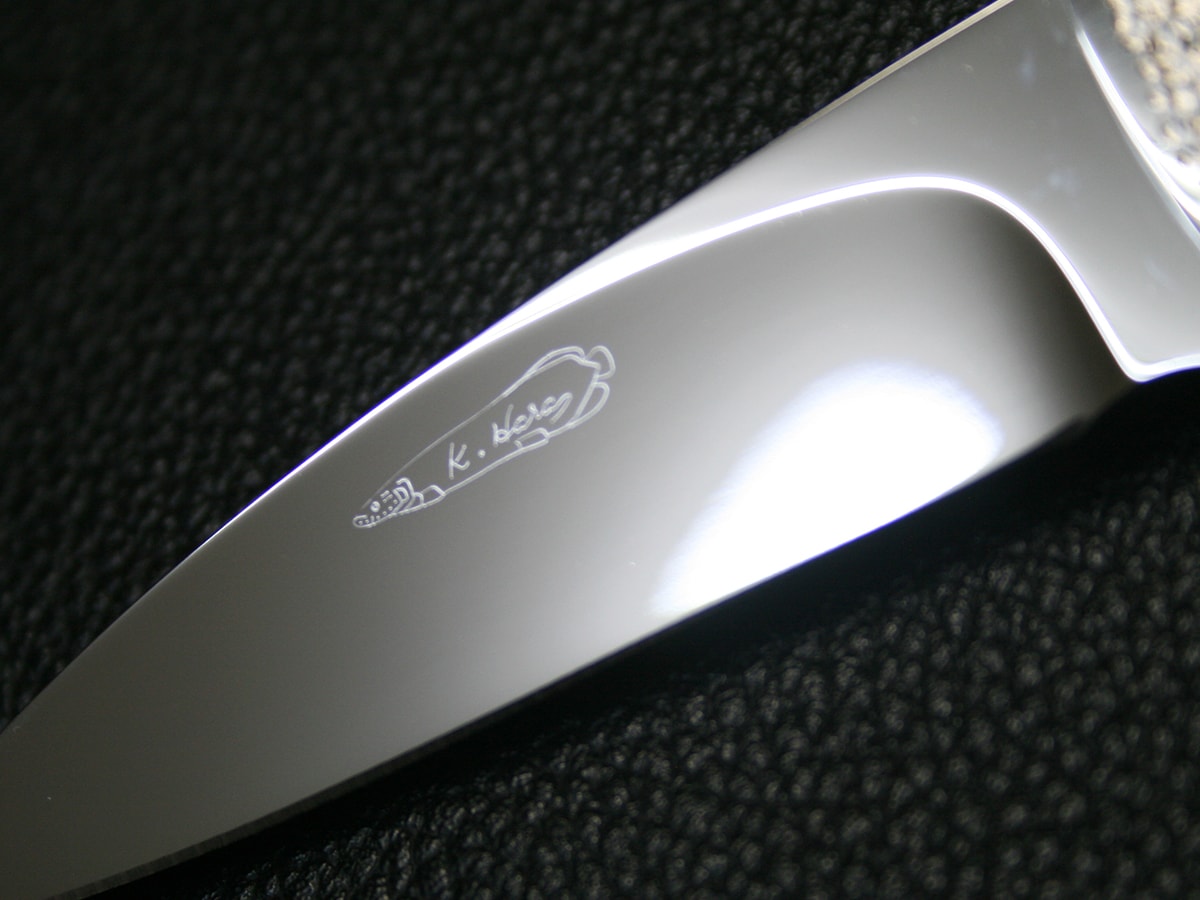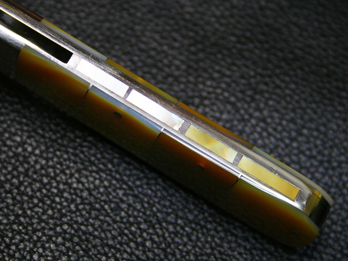 The flipper liner-lock folder by Koji Hara. It features a mirror polished Cowry-Y steel drop point style blade and hand-dimpled stainless steel bolster and perfectly shaped and polished gold lip pearl in the handle. Nickel silver spacer in each pearl. The spine of the handle spacer have gold lip pearl in it.