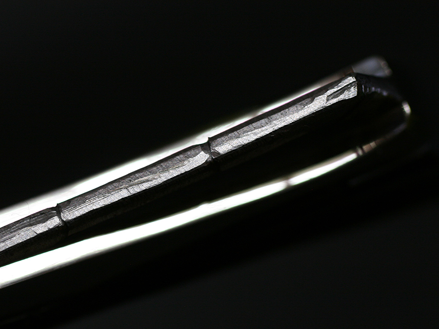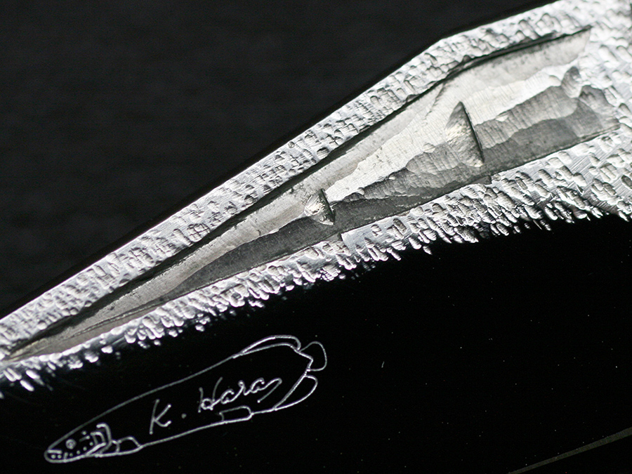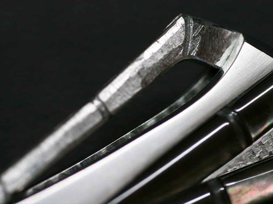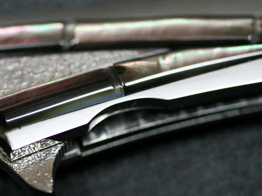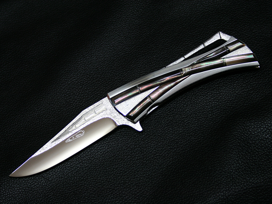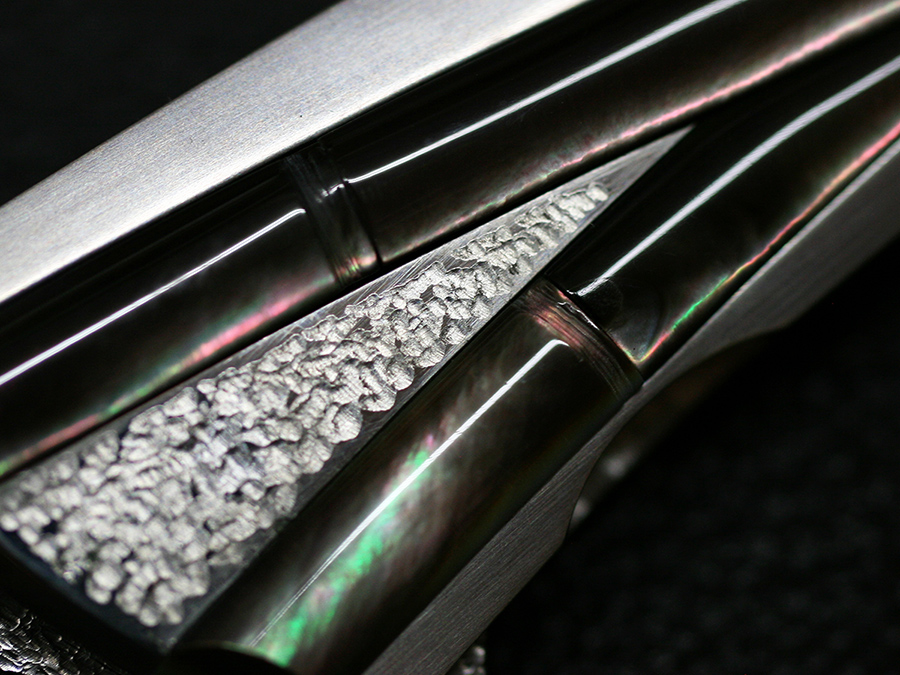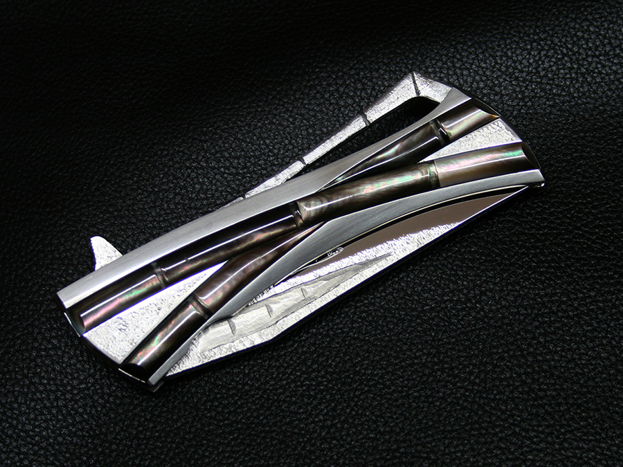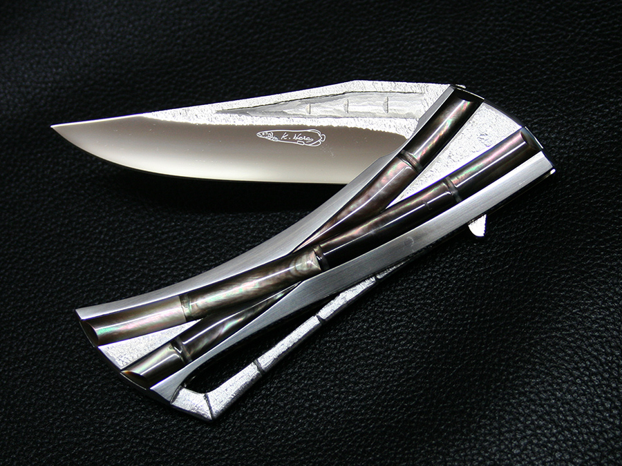 This tactical flipper liner-lock folder by Koji Hara features a High mirror polished Cowry-Y powdered steel blade, bamboo shape black lip pearl inlays in tsuchime and hairline finishes 316 stainless steel handle both sides.