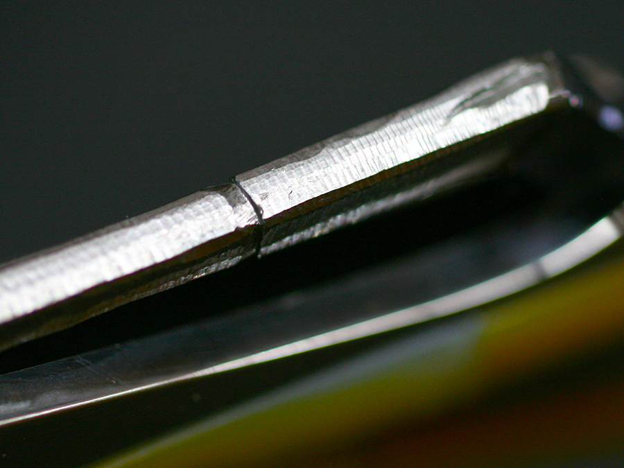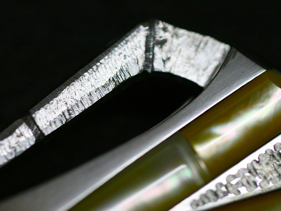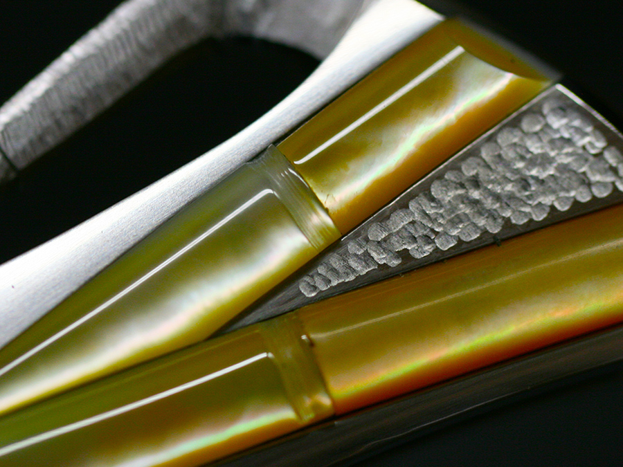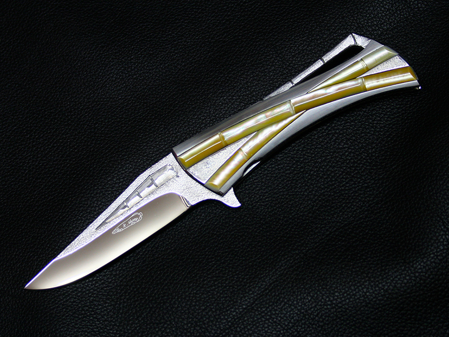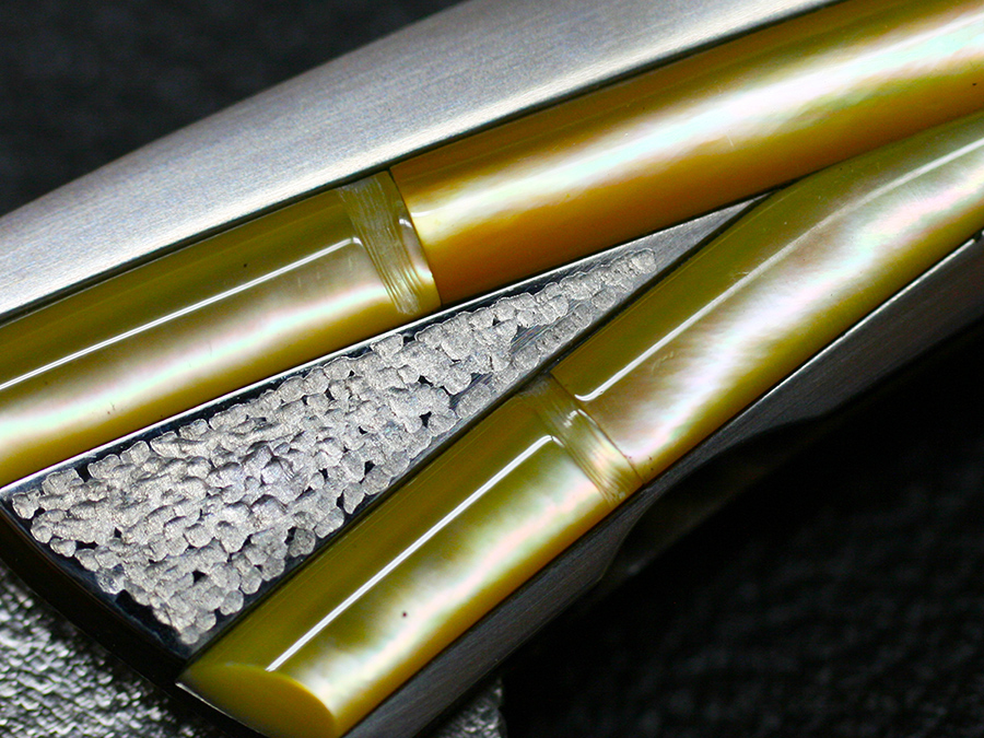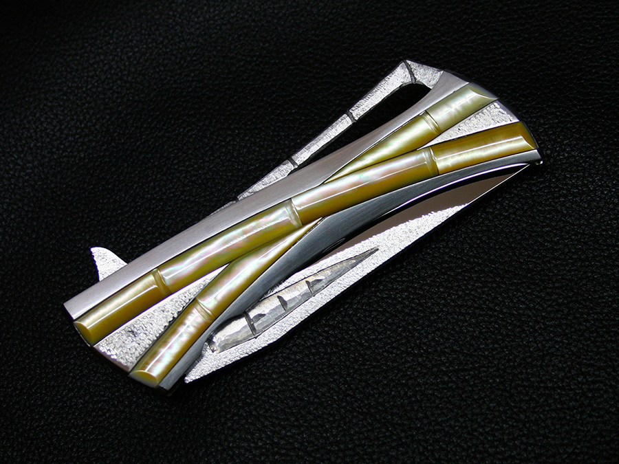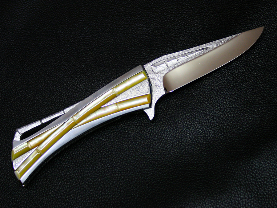 This tactical flipper liner-lock folder by Koji Hara features a High mirror polished Cowry-Y powdered steel blade, bamboo shape gold lip pearl inlays in tsuchime and hairline finishes 316 stainless steel handle both sides.