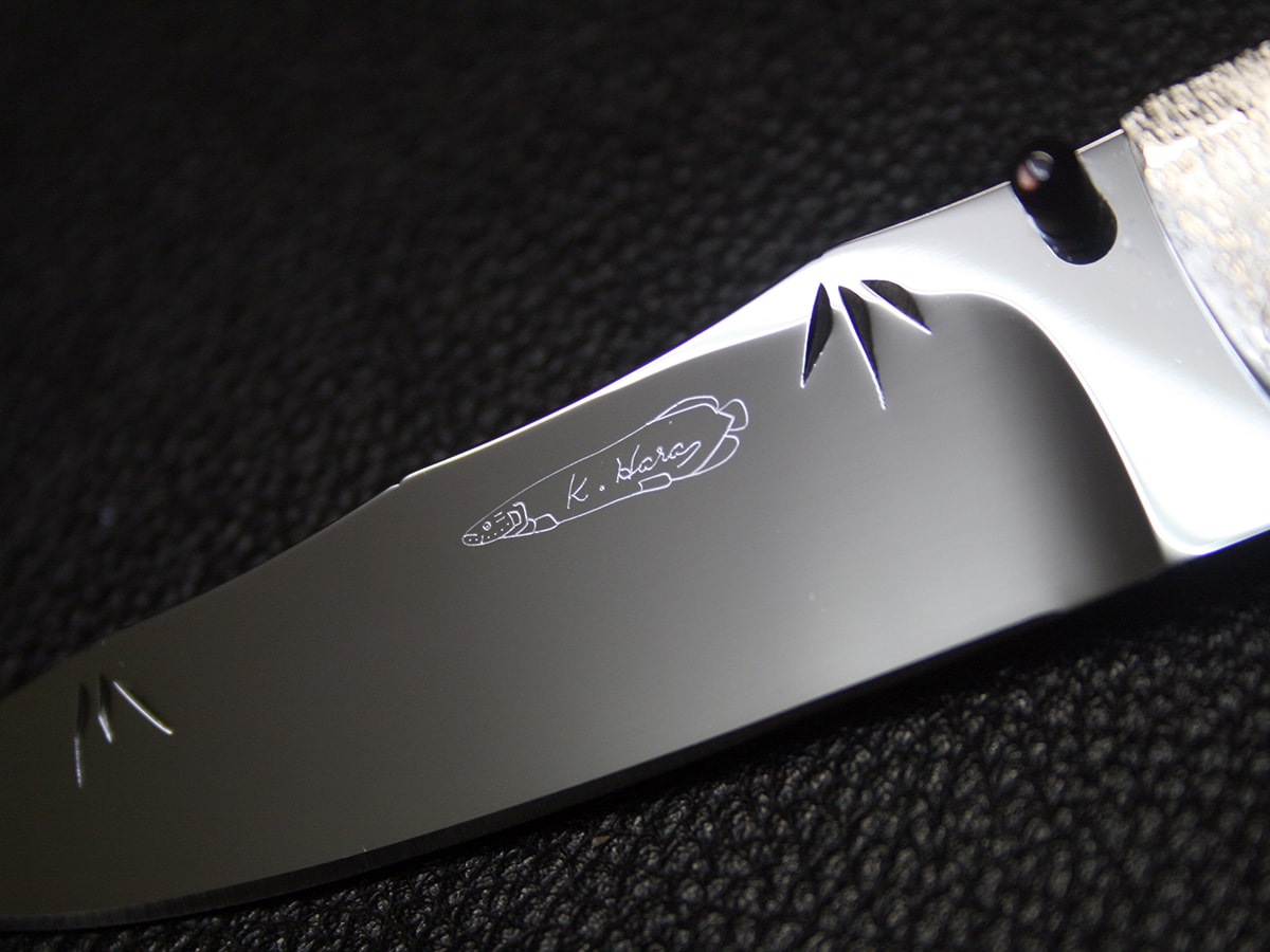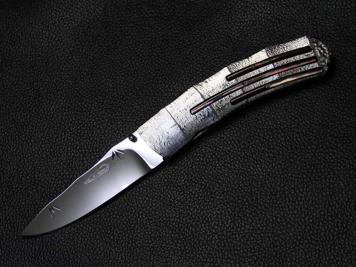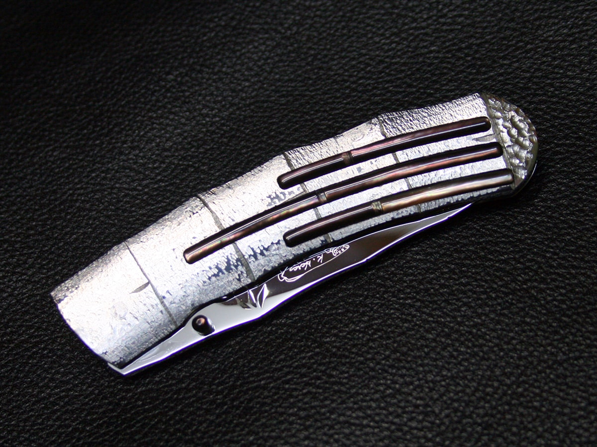 The liner-lock folder by Koji Hara. It features a mirror polished Cowry-Y steel drop point style blade and hand-dimpled stainless steel handle made to look like bamboo and inlays with black lip mother of pearl motif both sides. The spine of the blade and the handle spacer have a bamboo design and the blade has a bamboo leaf carved in it.