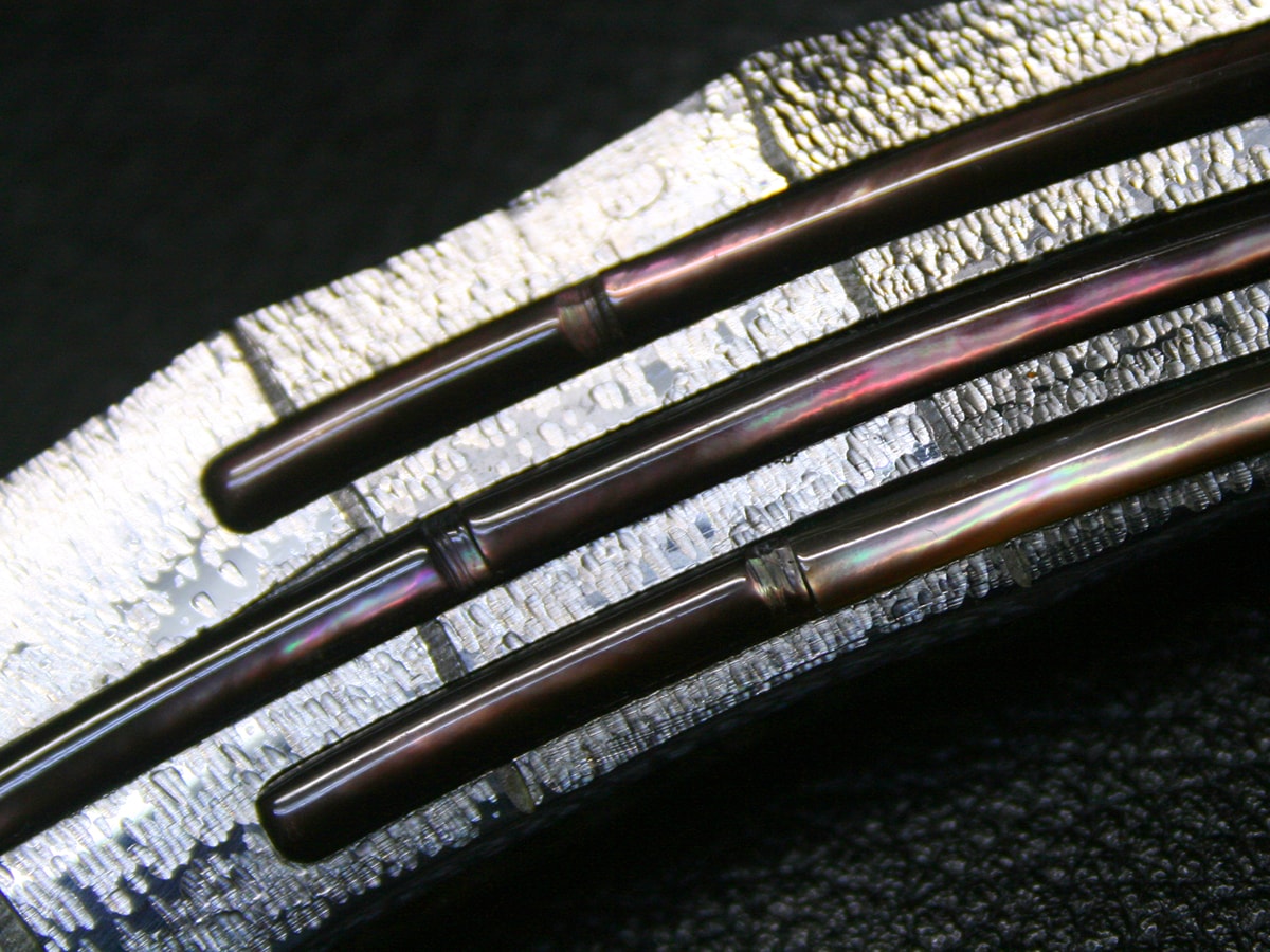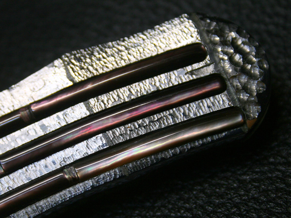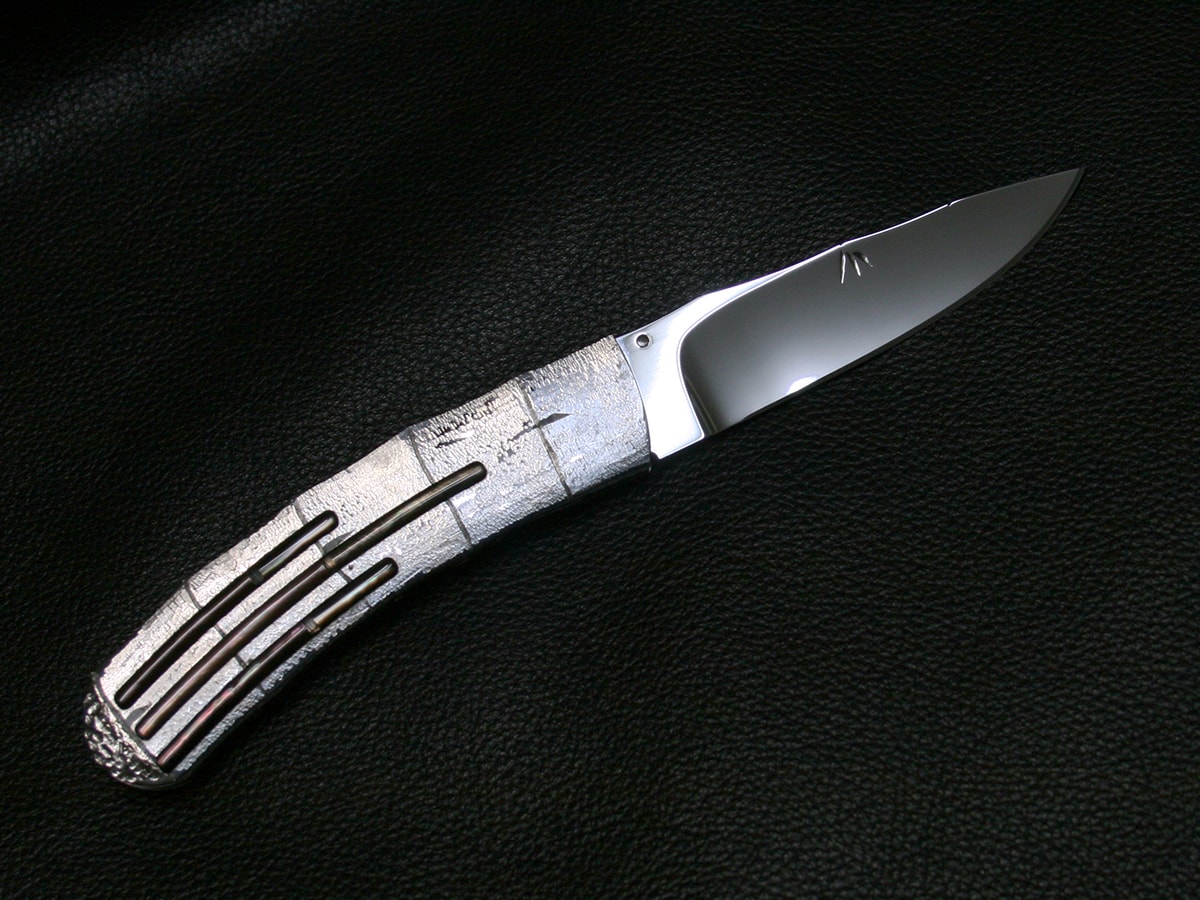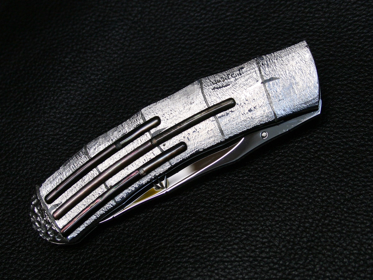 The liner-lock folder by Koji Hara. It features a mirror polished Cowry-Y steel drop point style blade and hand-dimpled stainless steel handle made to look like bamboo and inlays with black lip mother of pearl motif both sides. The spine of the blade and the handle spacer have a bamboo design and the blade has a bamboo leaf carved in it.