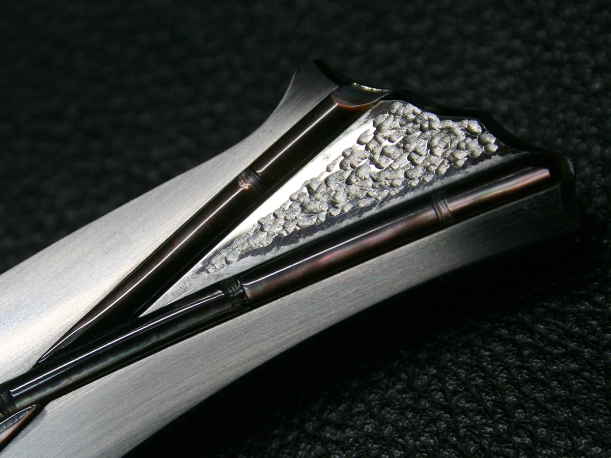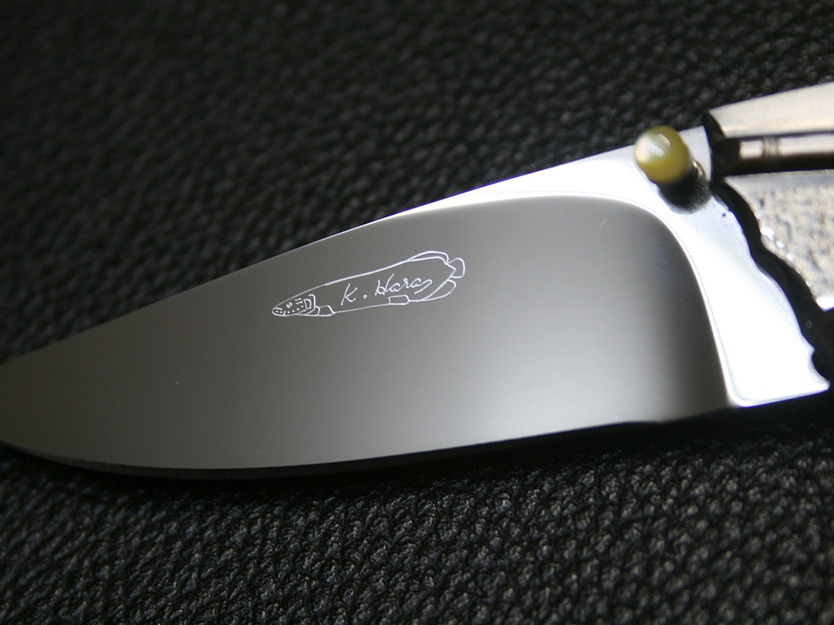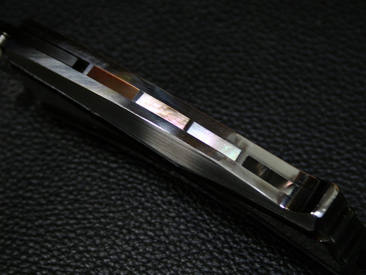 The liner-lock folder by Koji Hara. It features a mirror polished Cowry-Y steel drop point style blade and hand-dimpled, hand satin stainless steel handle made to look like bamboo and inlays with black lip pearl motif both sides. The spine of the handle spacer have black lip pearl in it.