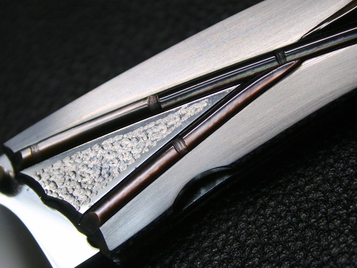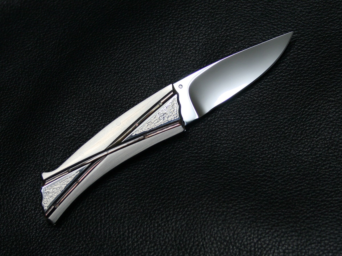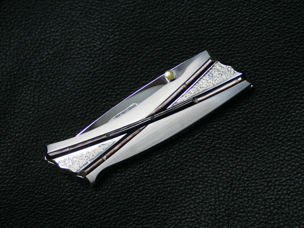 The liner-lock folder by Koji Hara. It features a mirror polished Cowry-Y steel drop point style blade and hand-dimpled, hand satin stainless steel handle made to look like bamboo and inlays with black lip pearl motif both sides. The spine of the handle spacer have black lip pearl in it.
