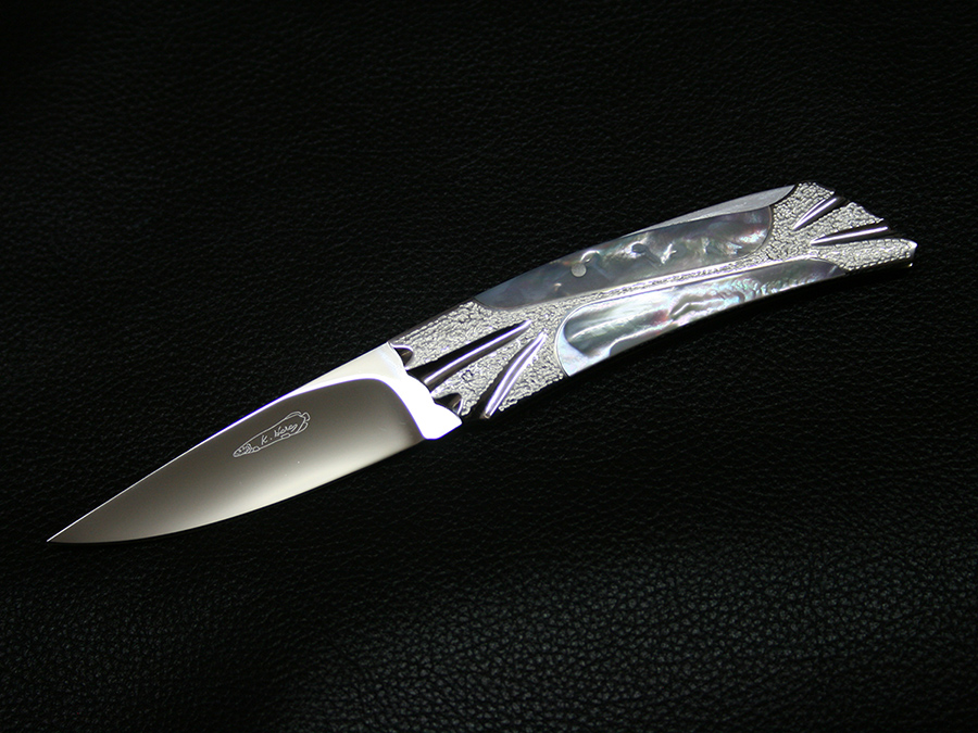 This lockback folder by Koji Hara features a High mirror polished Cowry-Y powdered steel blade and 316 stainless steel handle.