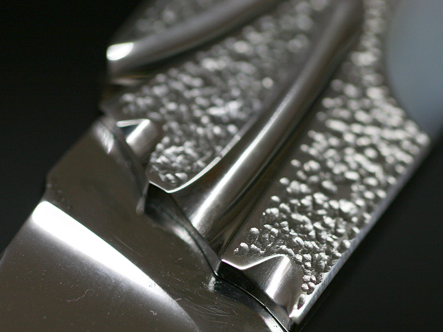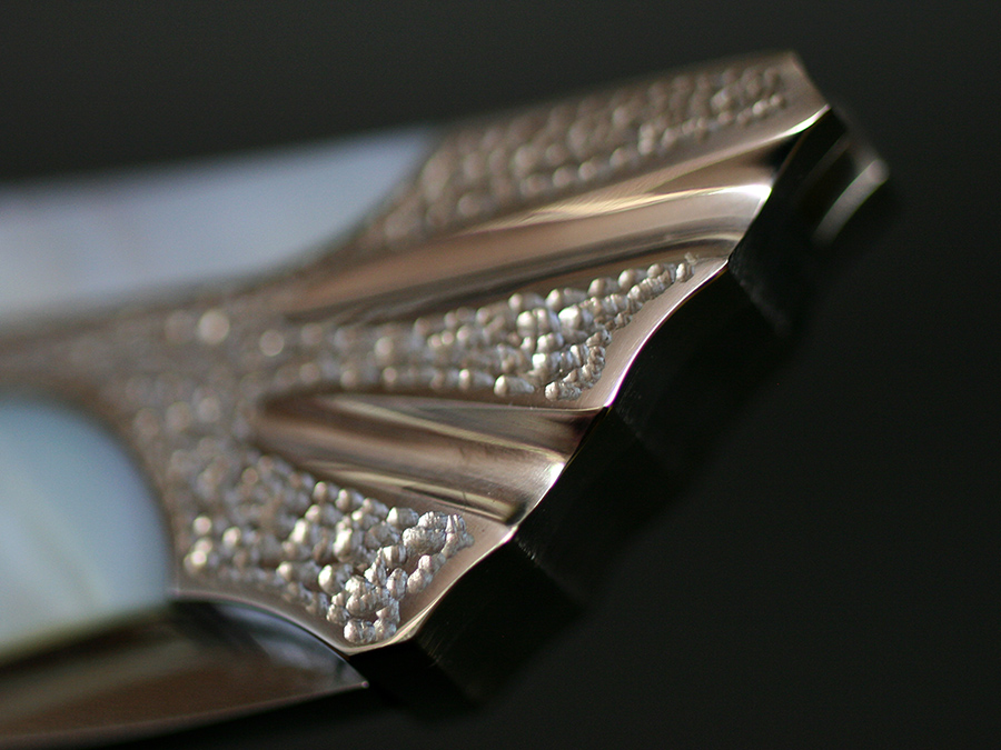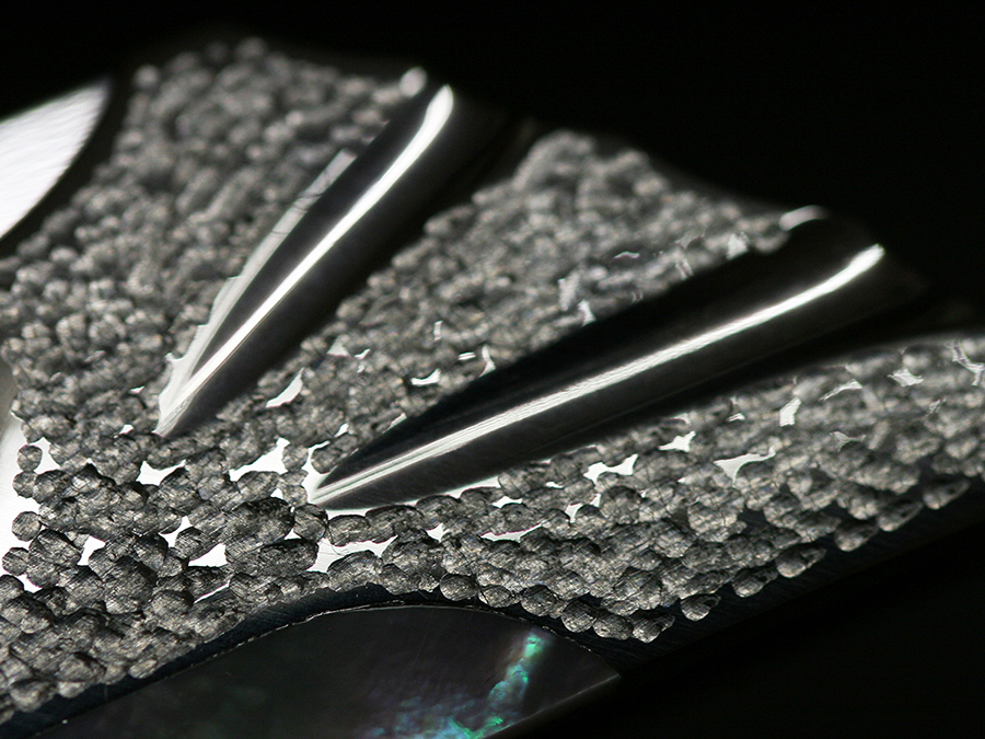 Hammered finish with polished grooves and Mother of Pearl inlyaed on both sides. Rounded bamboo motif on back.